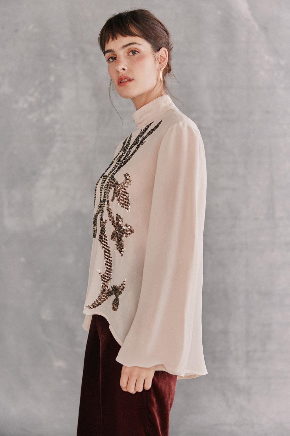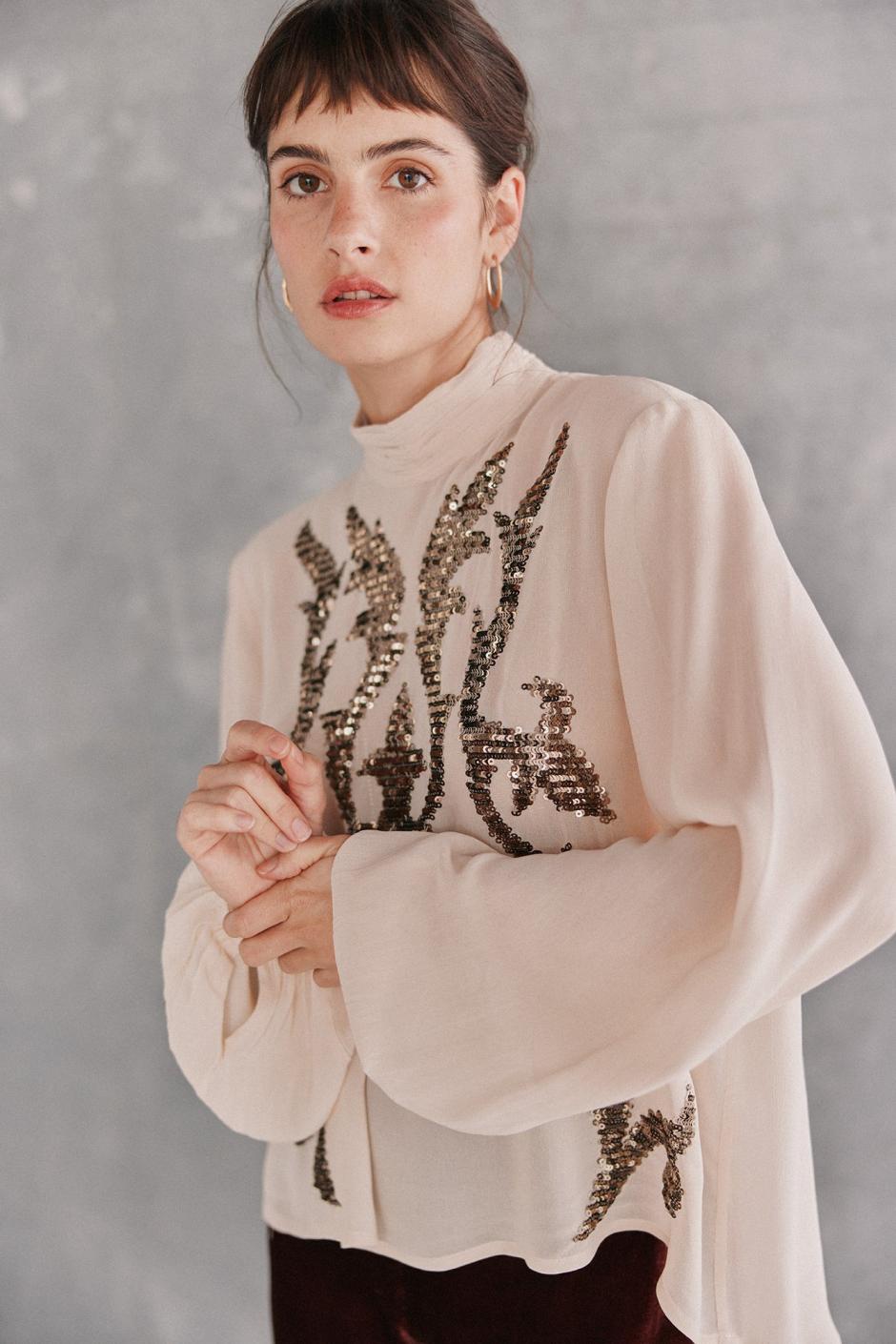 La blusa CELIA de Hoss intropia es romántica y elegante. Tiene cuello halter y manga larga. Su delicado tejido junto con el bordado de lentejuelas que cubre la parte delantera hacen de esta prenda una pieza única. Es una prenda muy especial y delicada, perfecta para ir sofisticada y con ese toque romántica tan caracteristico a tus eventos.