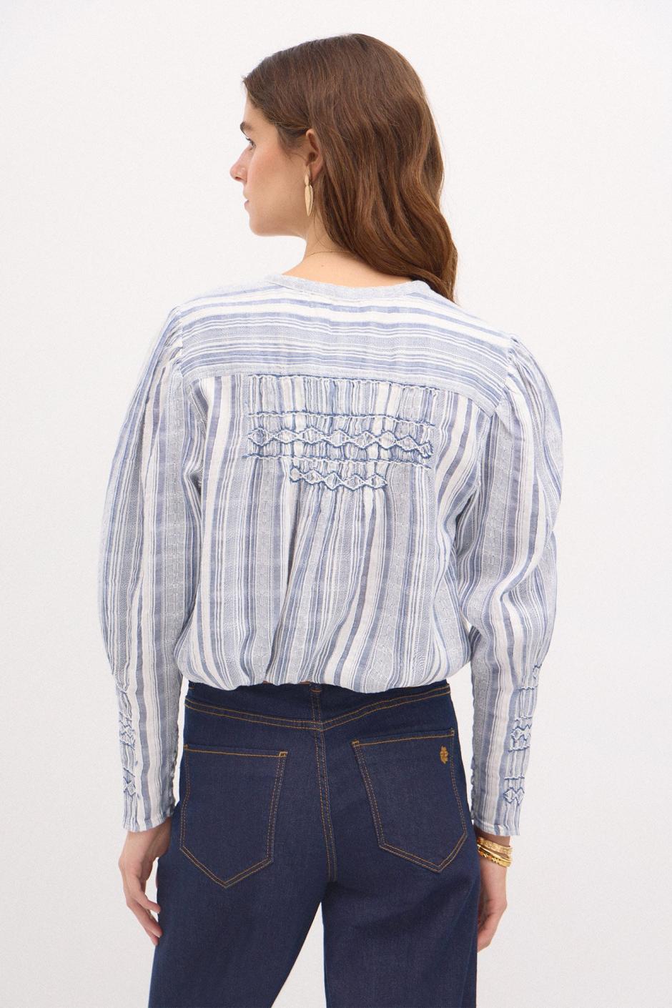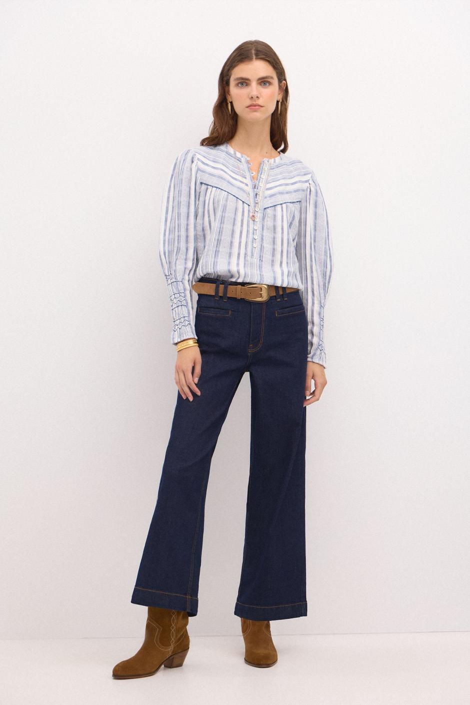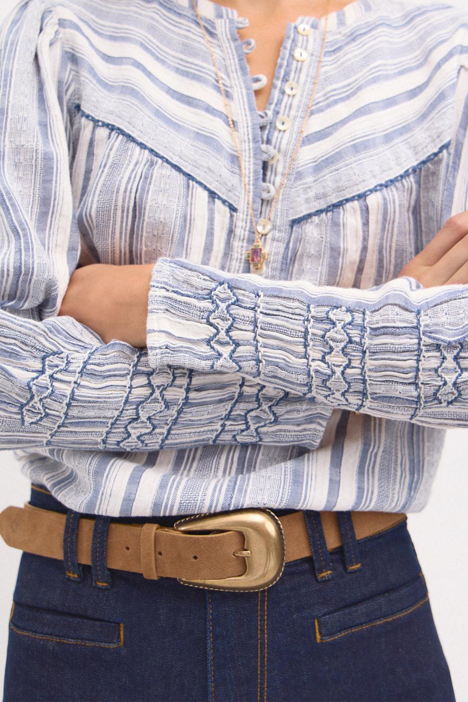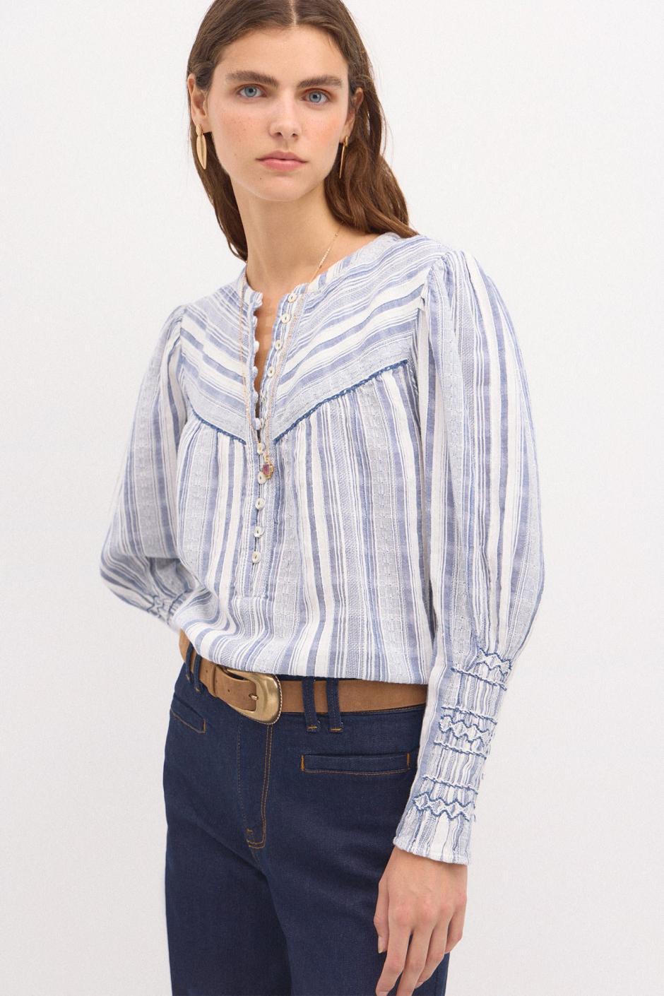 La camisa Celina de Hoss Intropia es una blusa con un tejido rústico de rayas muy delicado. Se trata de una blusa con canesú en pico, tapeta frontal con botones y cuello mao. Cuenta con una manga muy especial con goma canilla en el puño, detalle que marca la diferencia, con sus hilos a contraste azul. Esta camisa es una renovación de la raya de oficina en un look muy Hoss Intropia.