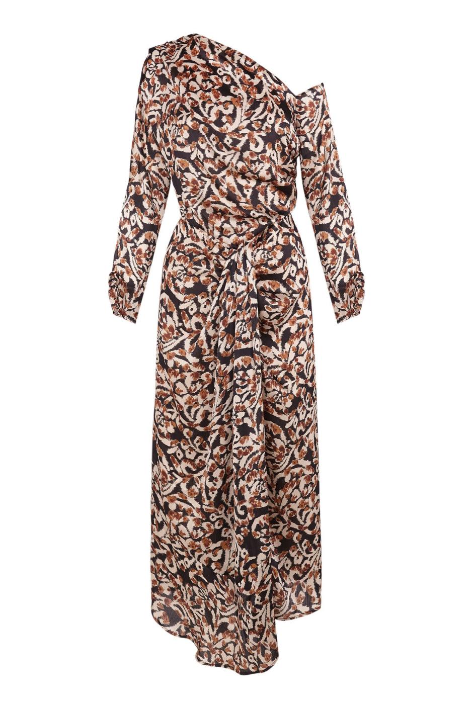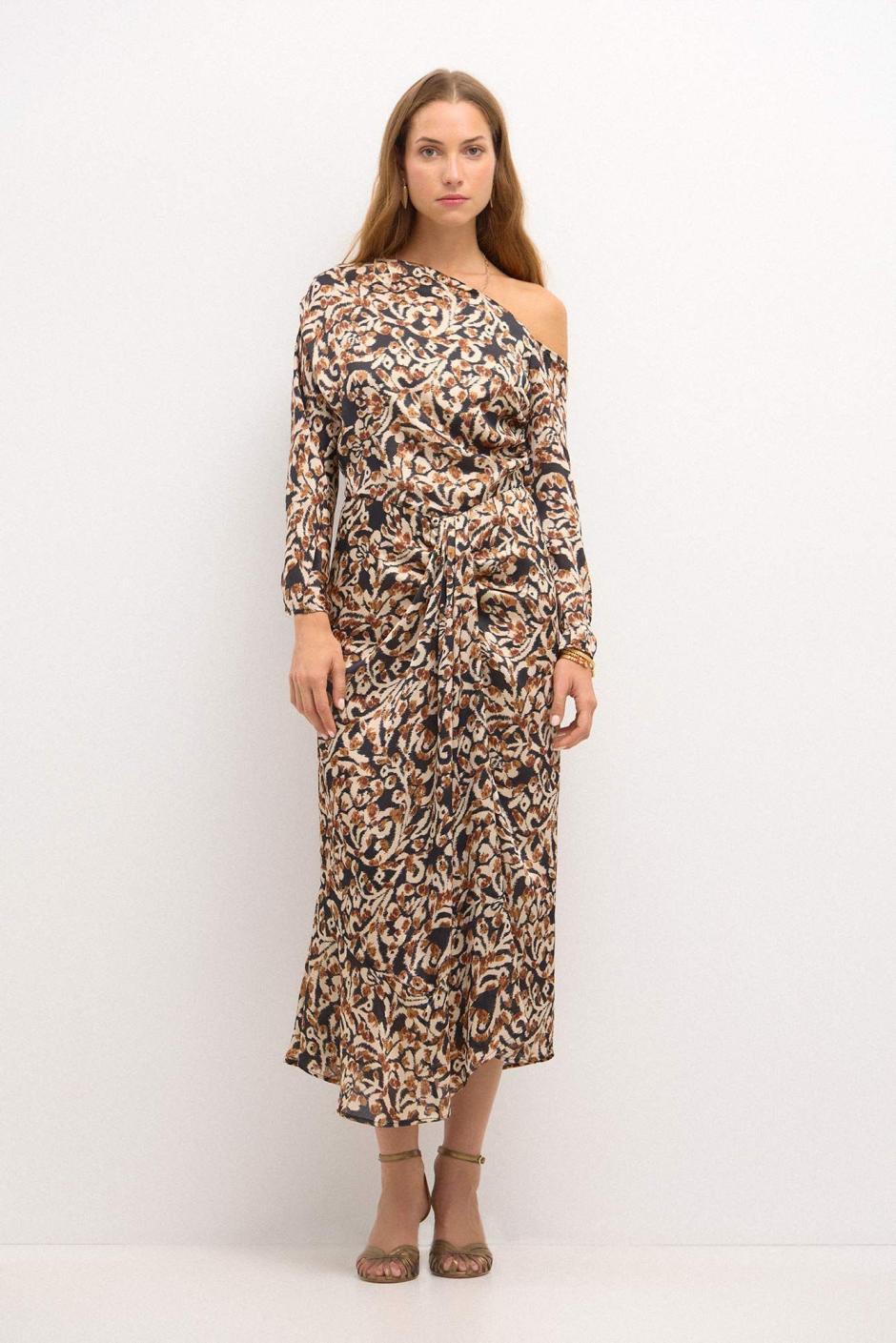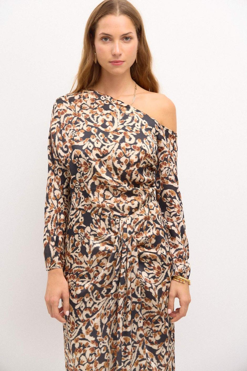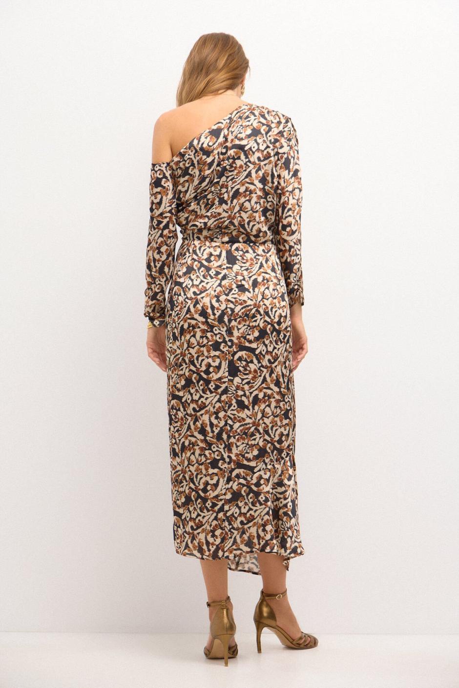 El vestido estampado Constantina de Hoss Intropia esta pensado para ser el perfecto aliado en tus eventos de invierno, perfecto para combinar con tacones y unos pendientes. El patrón es muy especial, tiene un hombro asimétrico que termina en dos mangas margas pegadas, dejando un hombro al descubierto. El cuerpo se ciñe a la cintura con un pequeño fruncido lateral y cremallera, la falda consta de un nudo frontal y un bajo asimétrico que acaba en un pequeño volante. Un patrón elavorado que sienta bien al cuerpo en un estampado que recuerda a un print animal siendo a la vez floral.