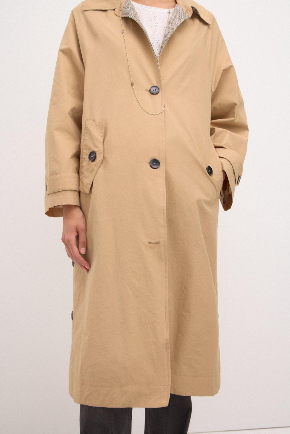 El abrigo DANAE de Hoss Intropia es un modelo de inspiración trench, con un corte oversize. Mangas ranglán, abertura en los laterales con botones y abertura trasera, esta pieza es simplemente soberbia. Nos encantan los amplios bolsillos con botón y el tejido de cuadros en el interior de la tapeta y el revés del cuello. Combínalo con todos tus looks de entretiempo para un estilo inimitable.