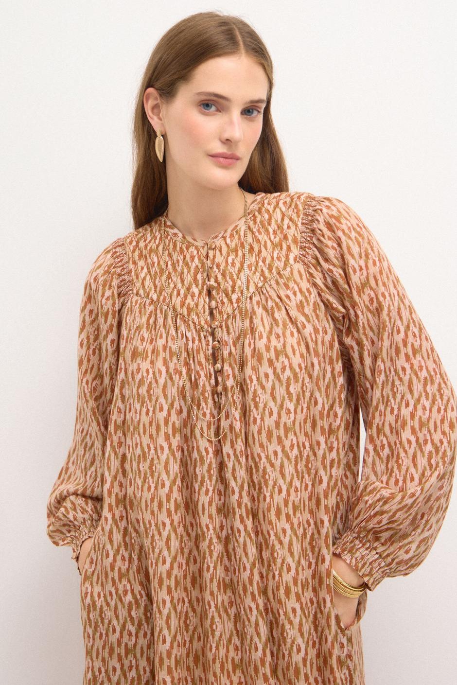 El vestido Rania de Hoss Intropia es un vestido largo estampado en manga larga. Se trata de una prenda de diario que te puede acompañar en cualquier ocasión, consta de una pechera con bordado tipo quilt, botones forrados y goma smock en el hombro. Estos pequeños detalles y su mini estampado ikat hacen de este vestido un vestido especial y delicado.