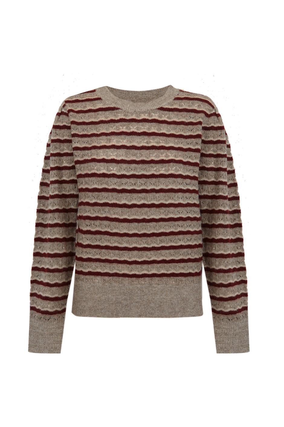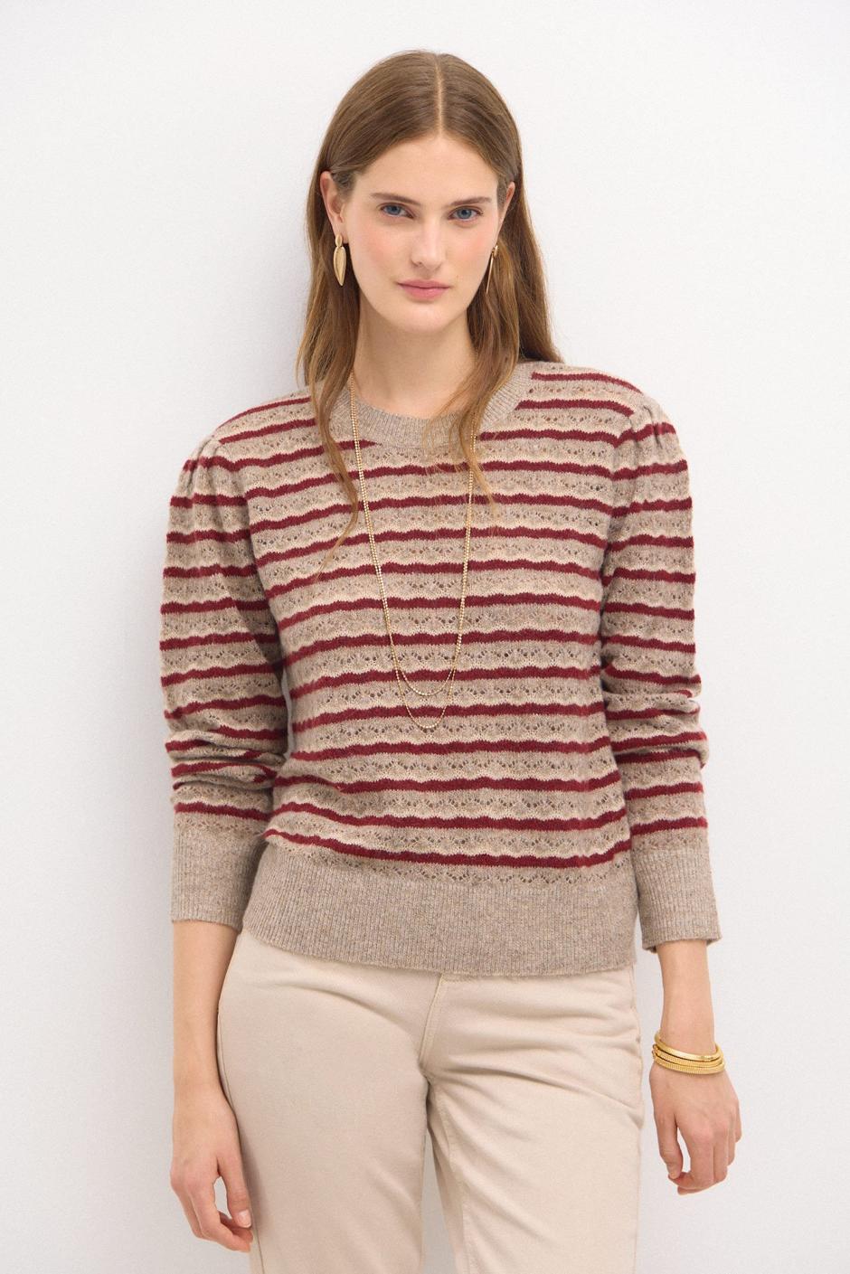 El jersey TELMA de Hoss Intropia es muy especial por su estructura calada combinada con rayas tricolores. Cuello caja, hombros fruncidos, puños y bajo de canalé ancho. Cabe destacar su tacto suave.