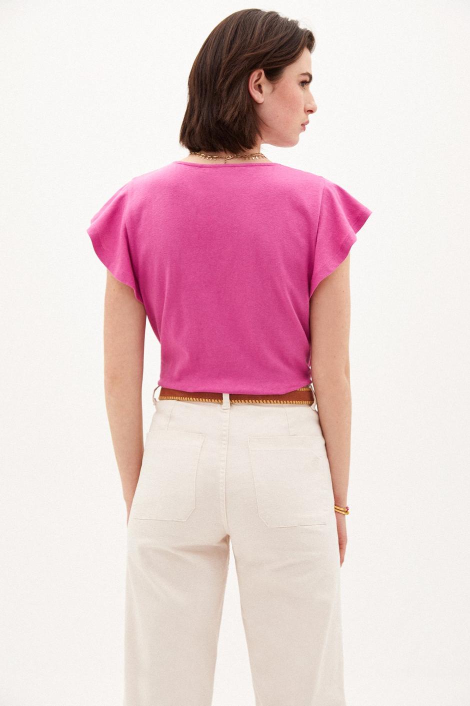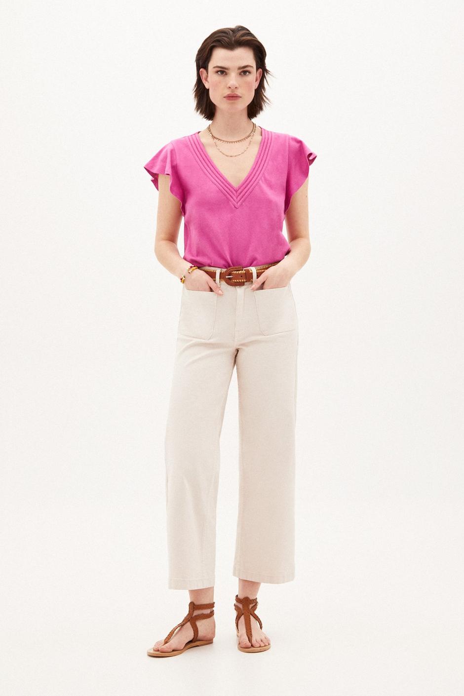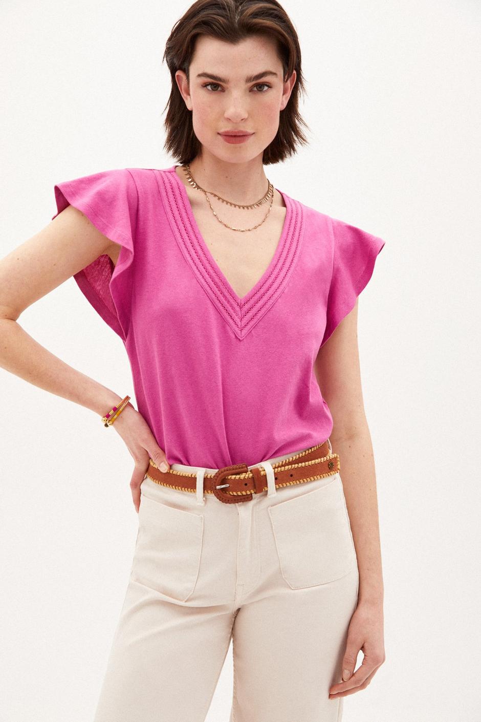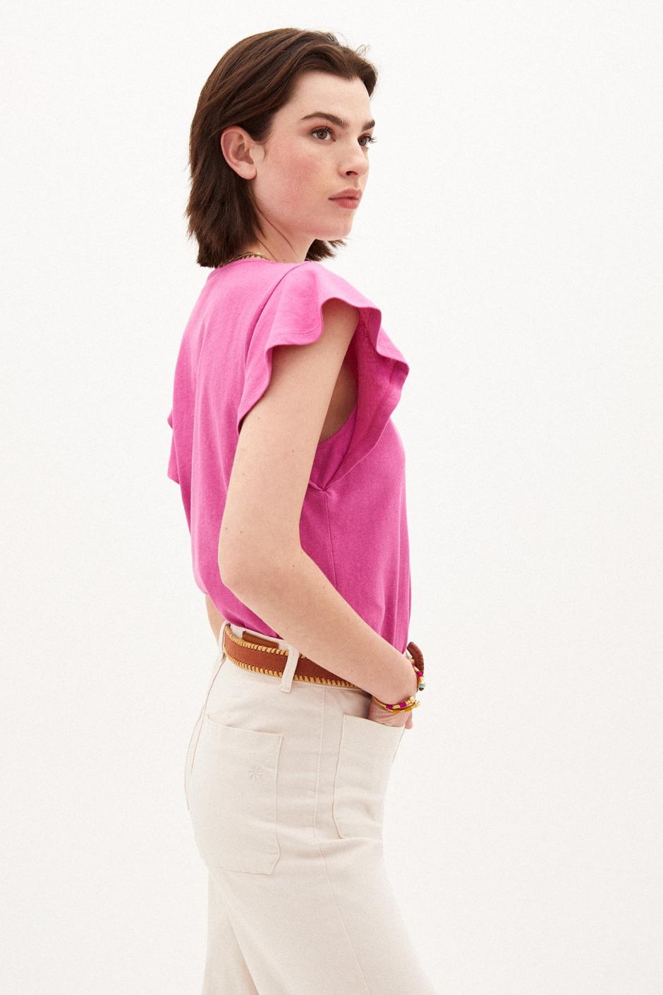 La camiseta VICKY de Hoss Intropia es un imprescindible, romántica, fácil de combinar con todos los estilos de ropa, se convertirá rápidamente en tu favorita. En mezcla de algodón y lino, es muy cómoda de llevar de día y de noche. Esta camiseta combina cuello de pico y manga corta con volante. Detalle que destaca, su bonito trabajo de trenzas que envuelven el escote. Para combinar con todo tu armario.- Camiseta mezcla algodón y lino- Cuello en V- Manga volante- Al elegir nuestros productos de algodón estás apoyando nuestra inversión en la iniciativa Better Cotton. Este producto se ha obtenido mediante un sistema de balance de masas y, por tanto, puede no contener Better Cotton